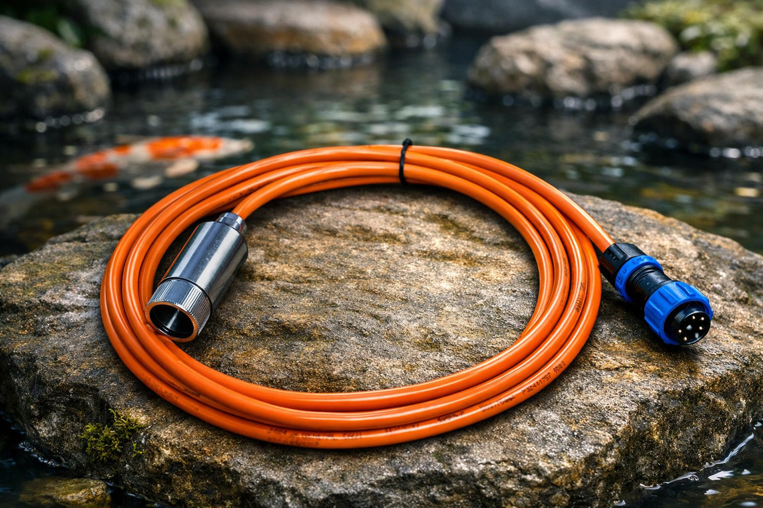 Das Kabelset besteht aus einem hochwertigen 4 Meter langen Kabel mit Schraubkupplung und Edelstahlkopf inkl. Dichtringen. Der Edelstahlkopf ist voll unter Wasser tauchbar.